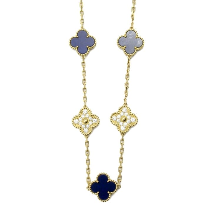 Authentic Van Cleef & Arpels Rare Paris Vendôme Vintage Alhambra Necklace – 18KT Yellow Gold, Diamonds & Blue Sèvres Porcelain – 20 Motifs