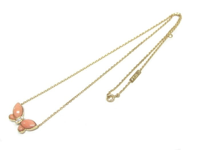 Authentic Van Cleef & Arpels Coral & Diamond 18KT Yellow Gold Papillon Butterfly Par Pendant Necklace Â
